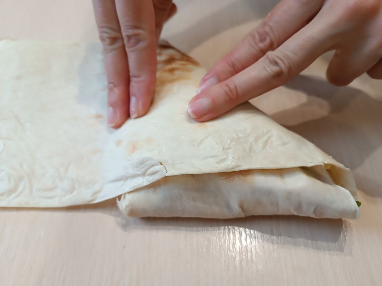 Лаваш разрежьте на квадраты со стороной примерно 15 см. На каждый квадрат выложите 1-2 столовые ложки начинки. Края лаваша заверните внутрь, формируя аккуратные конвертики. Старайтесь не переполнять начинкой, чтобы она не выпадала при жарке.