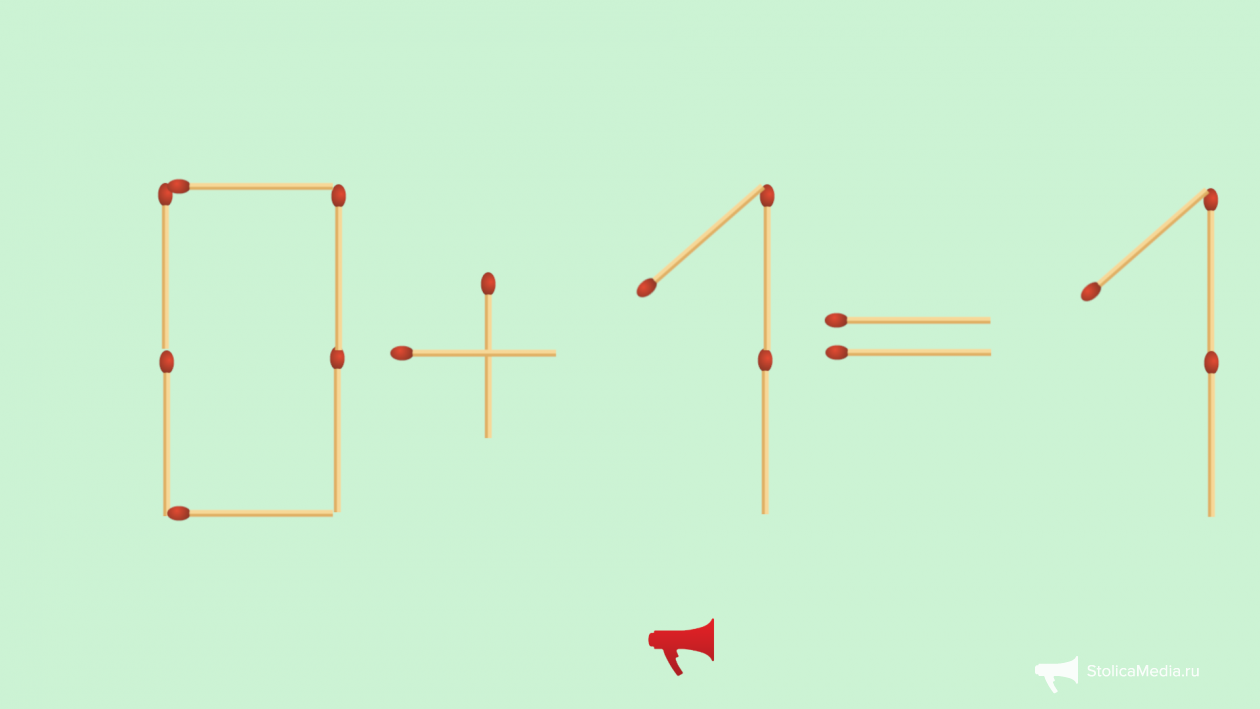 Решение кроется в том, чтобы превратить "8" в "0", а знак "минус" в "плюс". Забираем центральную спичку из цифры "8". Она превращается в "0". Эту же спичку подставляем к знаку "минус" (-), чтобы получился знак "плюс" (+). Получаем новое верное равенство.