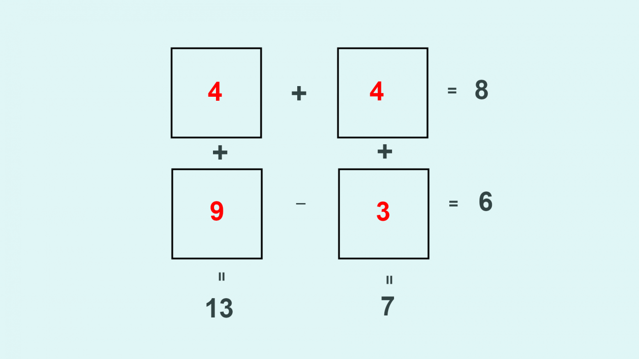 Исходя из картинки мы понимаем, верхние в сумме дают 8, левый столбик 13, правый — 7. Попробуйте решить сами и не листать вниз за подсказкой.