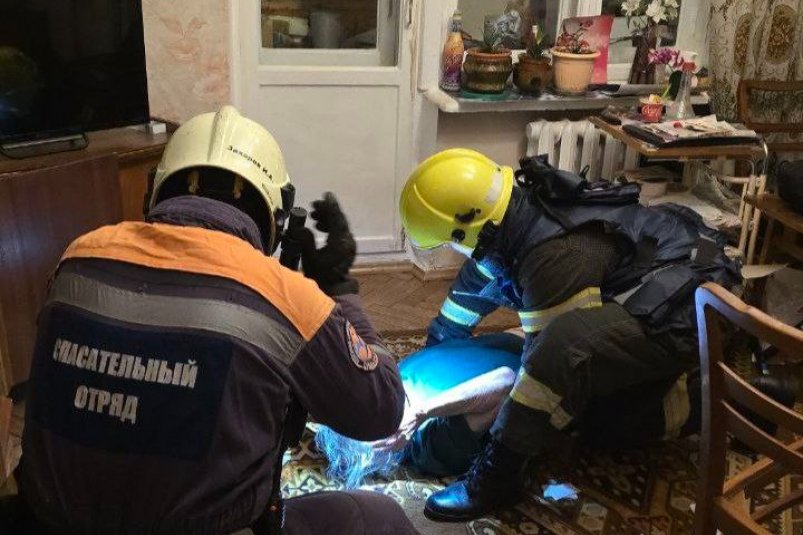 Дверь изнутри оказалась забаррикадирована стремянкой, которая была привязана к ручке и упиралась в пол. Спасатели аккуратно отжали полотно, разобрали конструкцию и проникли в квартиру.