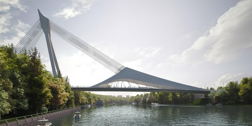 Еще одна особенность технологии — возможность создавать выразительный архитектурный облик. Пешеходные мосты в Мневниковской пойме получат арочные формы, напоминающие крылья, а автомобильный мост через Москву-реку у Рублевского шоссе украсят пилоном кольцеобразной формы.