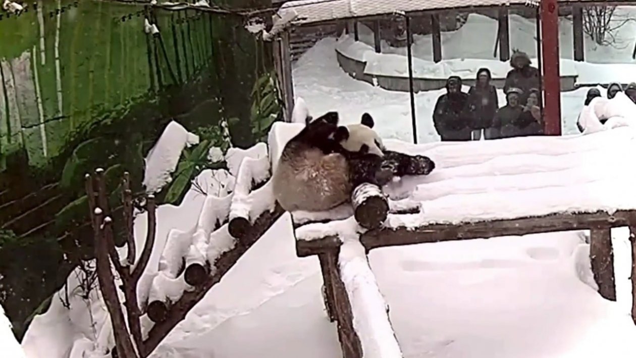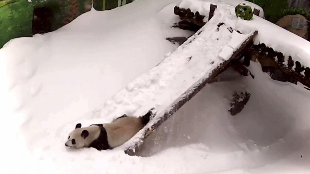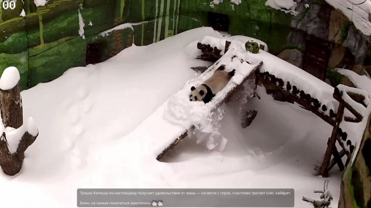 На кадрах видно, как Катюша появляется на вершине наклонной платформы. Панда осторожно ложится на живот, словно прицеливаясь, а затем уверенно скользит вниз, разбрасывая лапами снег по сторонам. Во время спуска она не пытается затормозить — наоборот, кажется, что процесс доставляет ей явное удовольствие.