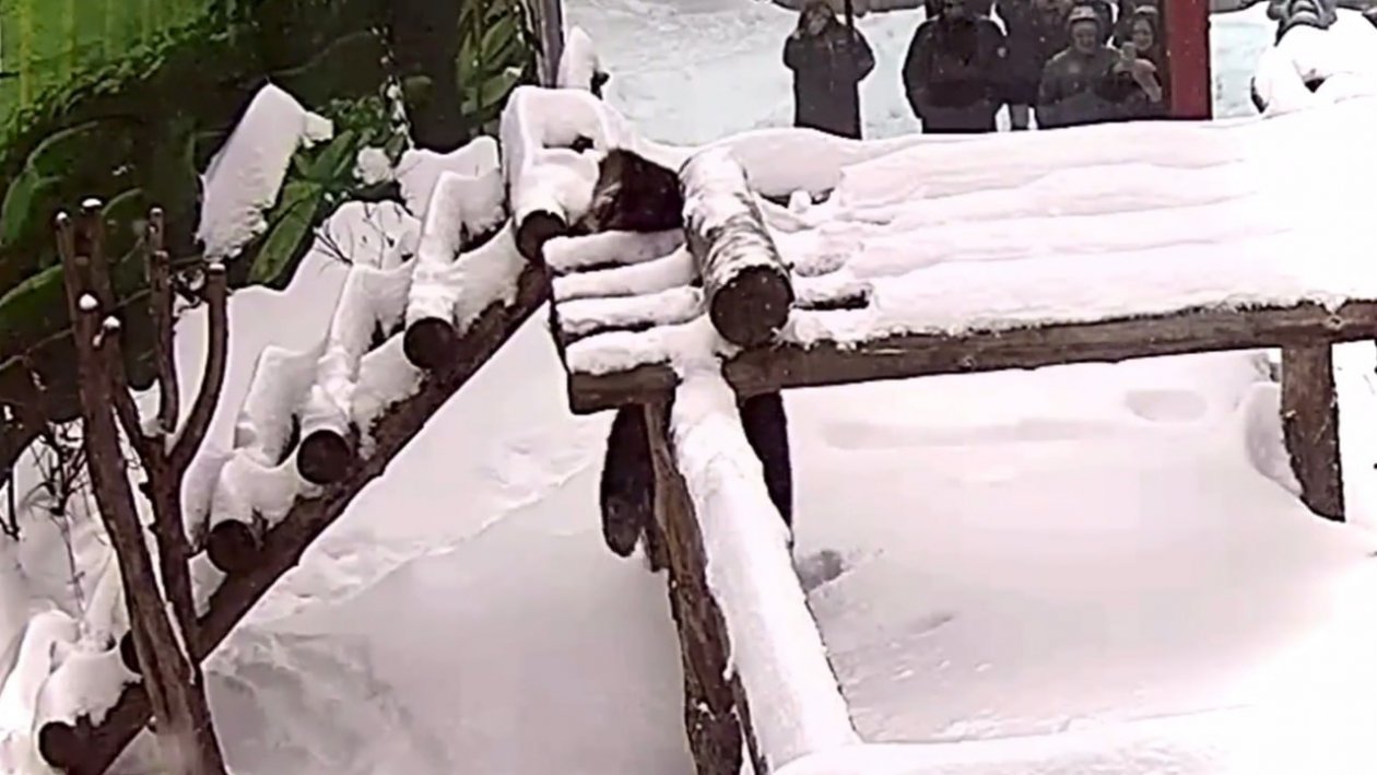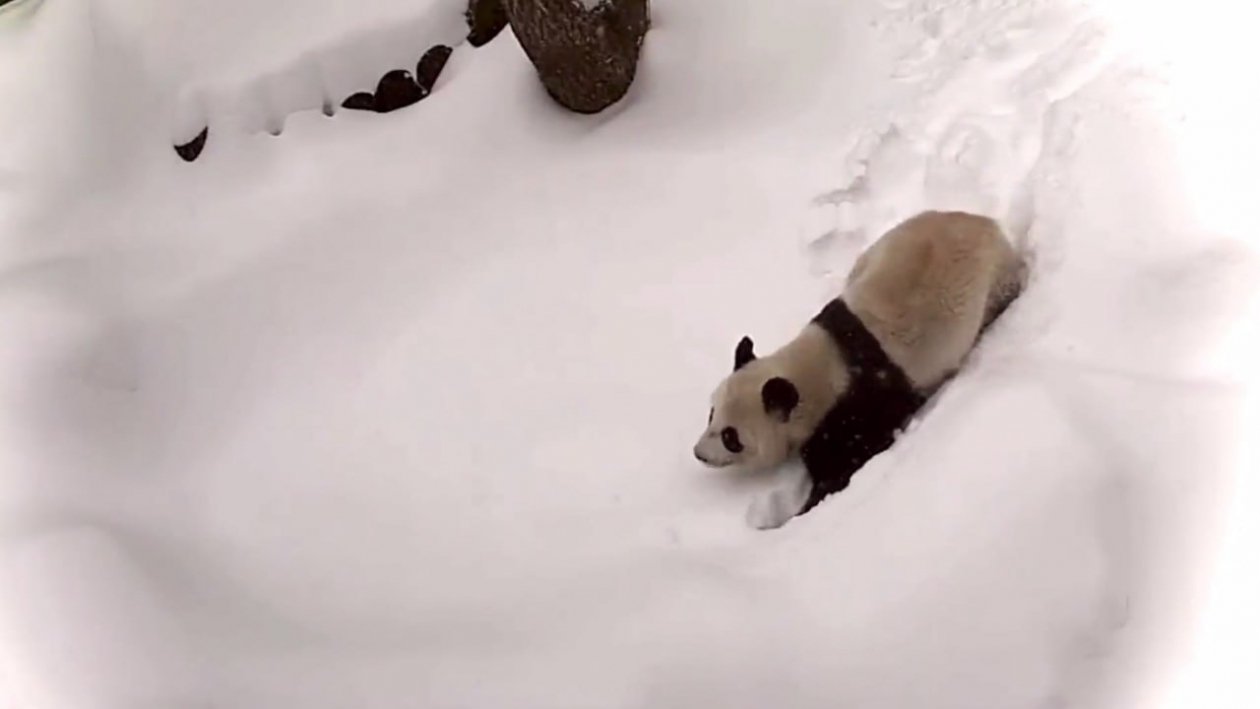 Затем панда уже оказывается внизу и, не вставая, продвигается вперед, утопая в снегу почти по плечи. Позже панда снова возвращается наверх, устраивается на платформе и ненадолго замирает, раскинув лапы, как будто наслаждаясь моментом и вниманием зрителей, которые наблюдают за происходящим через стекло.