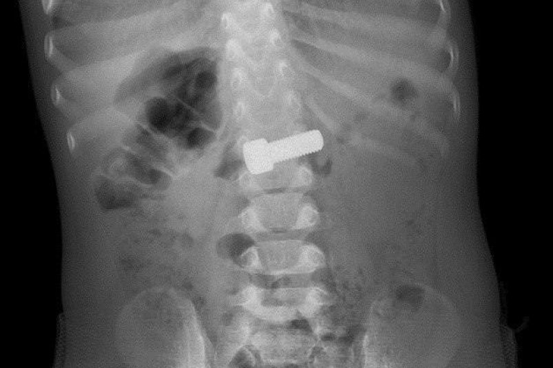Ребенок во время игры нашел металлический болт и проглотил его. Родители сразу заметили опасность и вызвали скорую помощь. Малыша доставили в приемное отделение центра, где ему оперативно сделали рентгеновское исследование. Снимок показал, что предмет уже находится в желудке.
