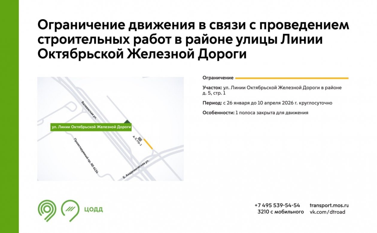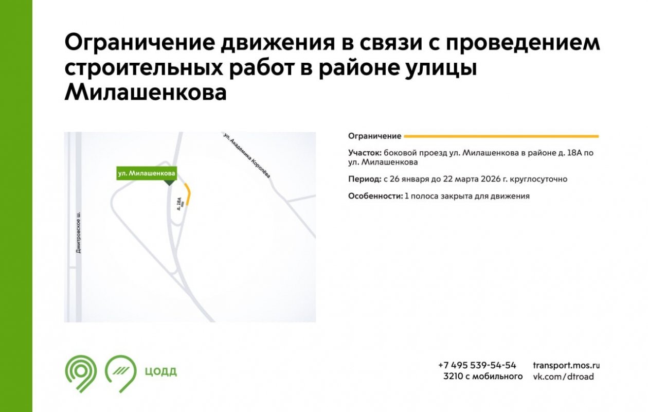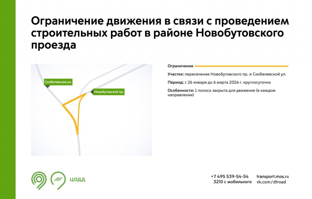 Также с 26 января по 6 марта движение по одной полосе ограничат на Новобутовском проезде и Скобелевской улице. До 22 марта аналогичные меры вводятся на боковом проезде улицы Милашенкова, а до 10 апреля — на улице Линии Октябрьской Железной Дороги.