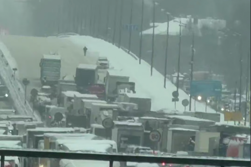 На кадрах видно, как дорога уходит в подъем, полностью занятый фурами и грузовиками. Большегрузы стоят вплотную друг к другу, между ними мигают стоп-сигналы, а проезжая часть покрыта плотным слоем снега. По краям трассы заметны сугробы, а видимость снижена из-за продолжающегося снегопада. Вдали можно разглядеть включенные проблесковые маячки спецслужб, которые пытаются стабилизировать обстановку.