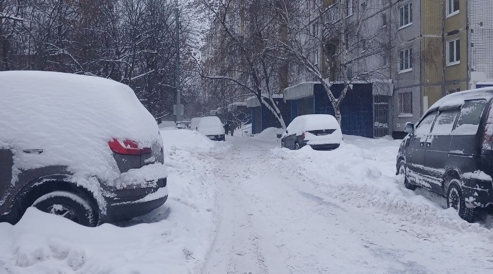 Припаркованные автомобили буквально утонули в сугробах: колеса, бамперы и капоты скрыты под плотным слоем снега. Во дворах и на узких улицах машины с трудом выбираются с парковок, колеса буксуют, а выезд занимает по нескольку минут.