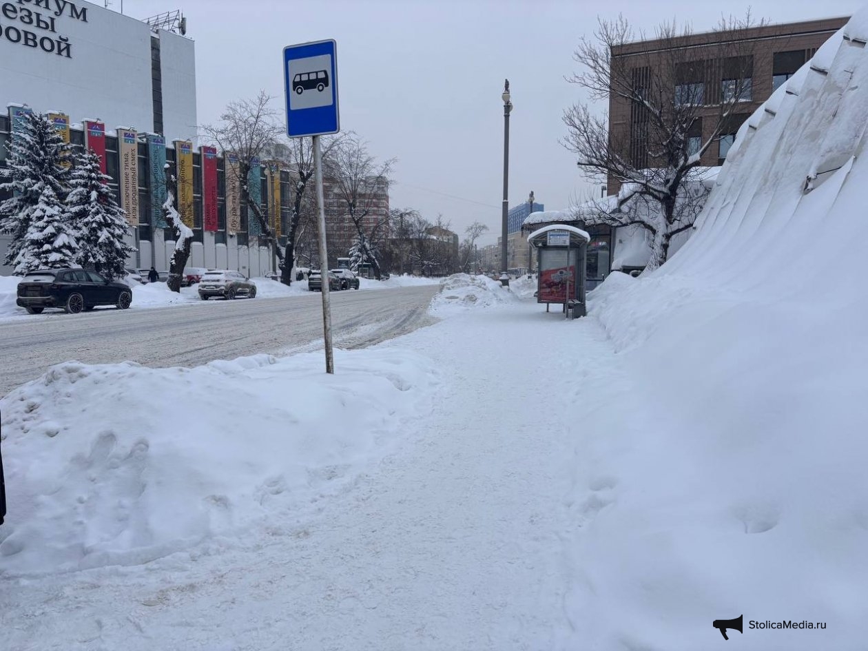 На других фотографиях запечатлены остановки общественного транспорта, утопающие в снегу, и автобусы, к которым пассажиры идут по нечищеным тропам. Видны сугробы вдоль тротуаров, сузившие проезжую часть, и пешеходы, осторожно переходящие скользкие улицы.