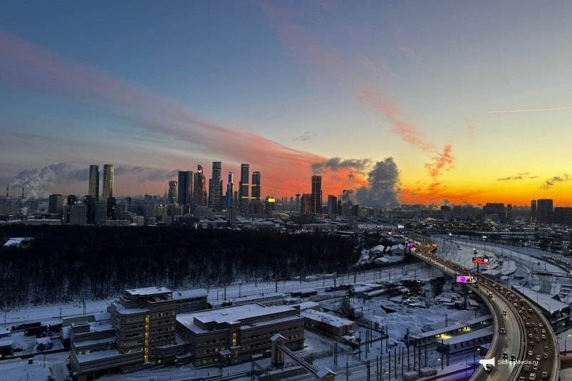 Фотографии распространяются по всей Сети. Очевидцы тоже поделились своими снимками с ИА StolicaMedia. На них видно, как над городом раскинулось небо с насыщенными розовыми, оранжевыми и красными полосами, которые постепенно переходят в холодные синие оттенки. Силуэты деловых кварталов, заснеженные улицы и оживленные магистрали лишь усиливают драматичность картины.