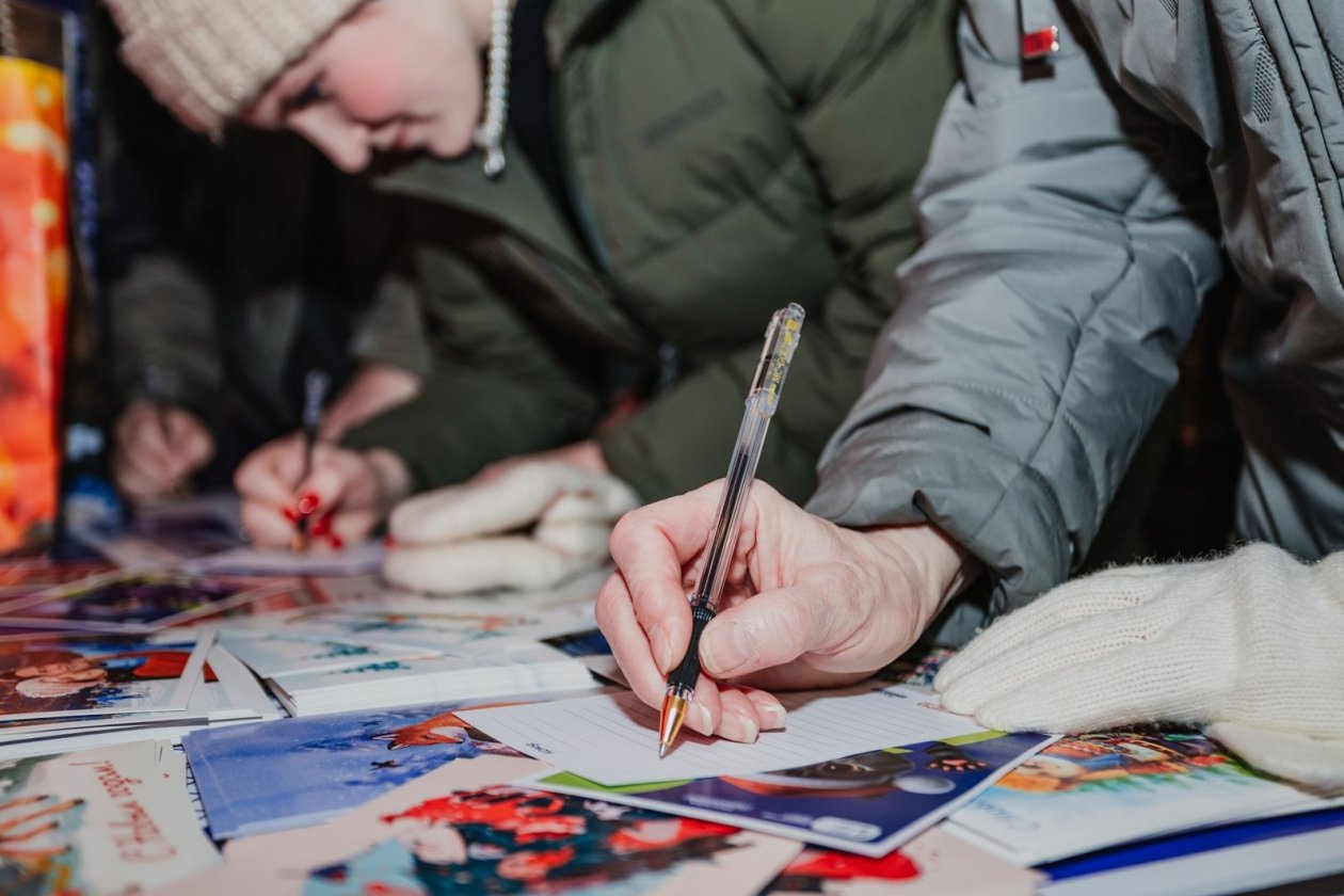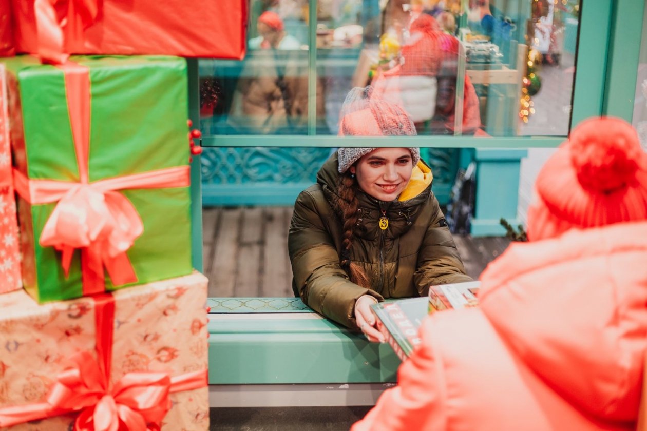 В павильонах гостей встречают волонтеры в красных куртках, белых шапках и варежках. Они принимают товары, проверяют их срок годности (не менее 3 месяцев со дня передачи) и знакомят посетителей со списком возможных подарков.