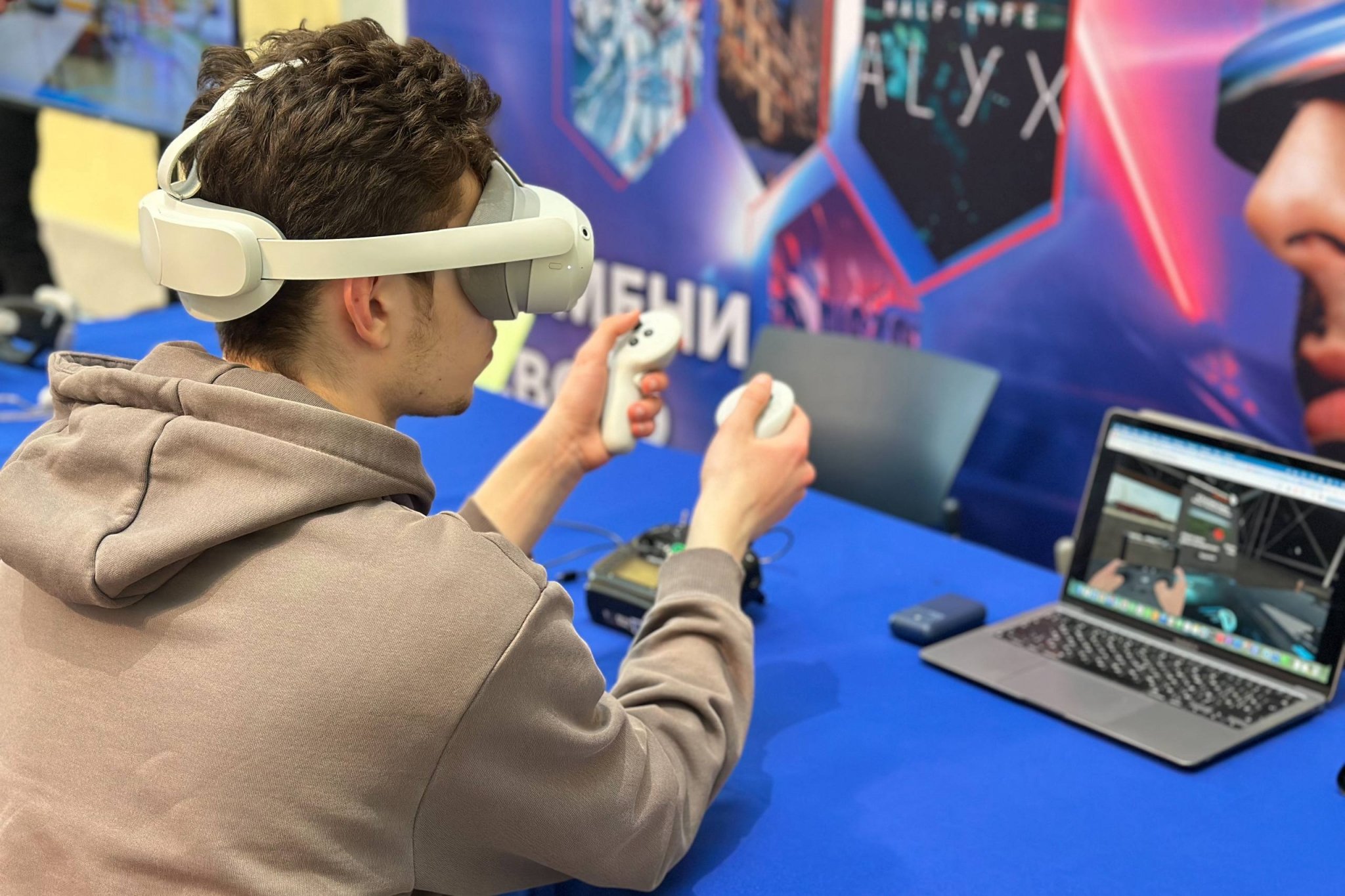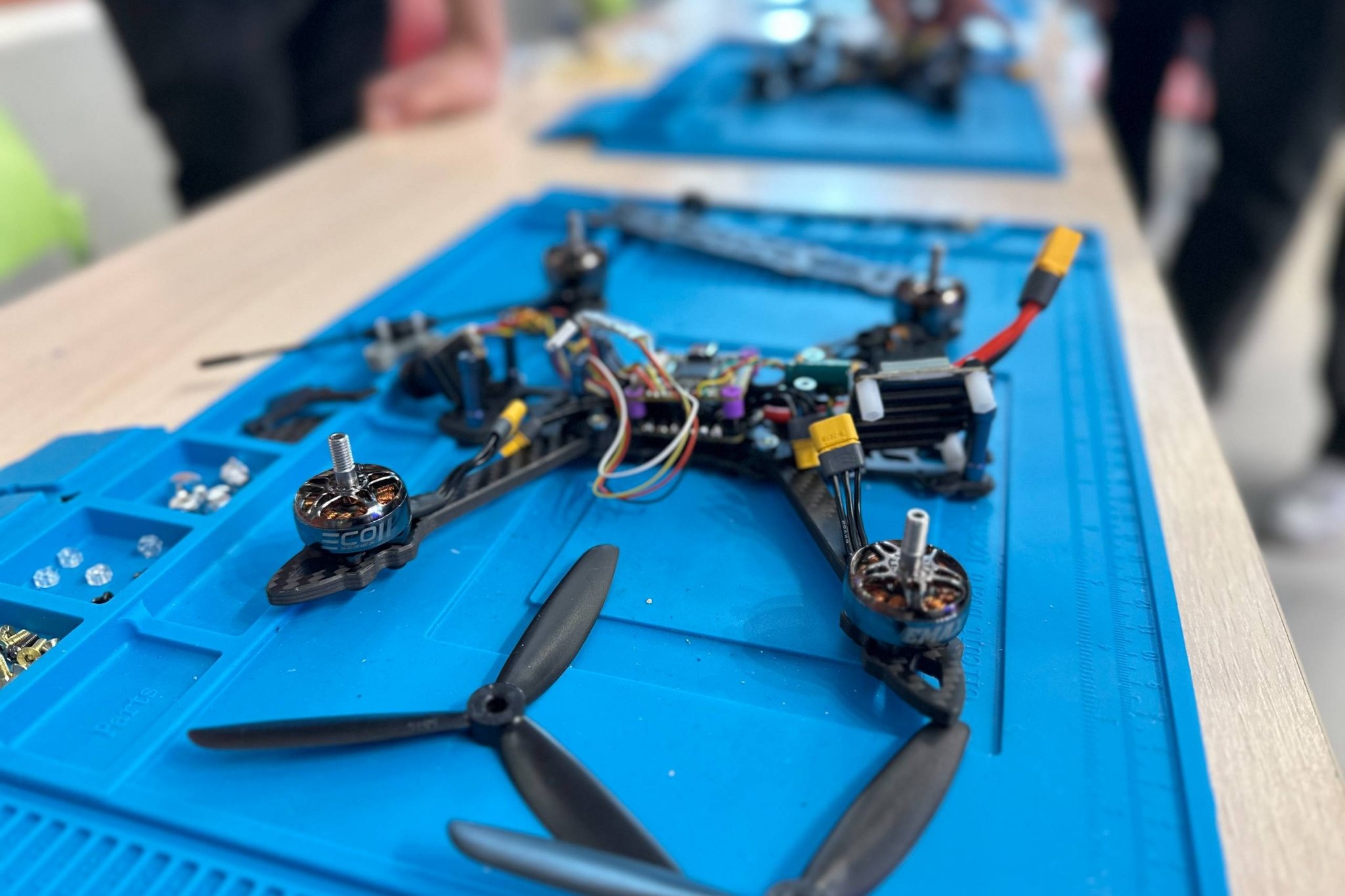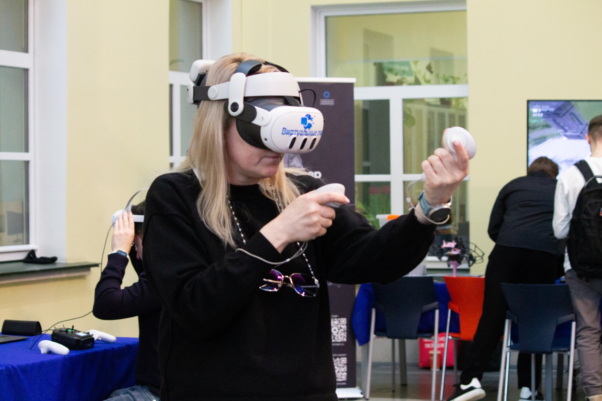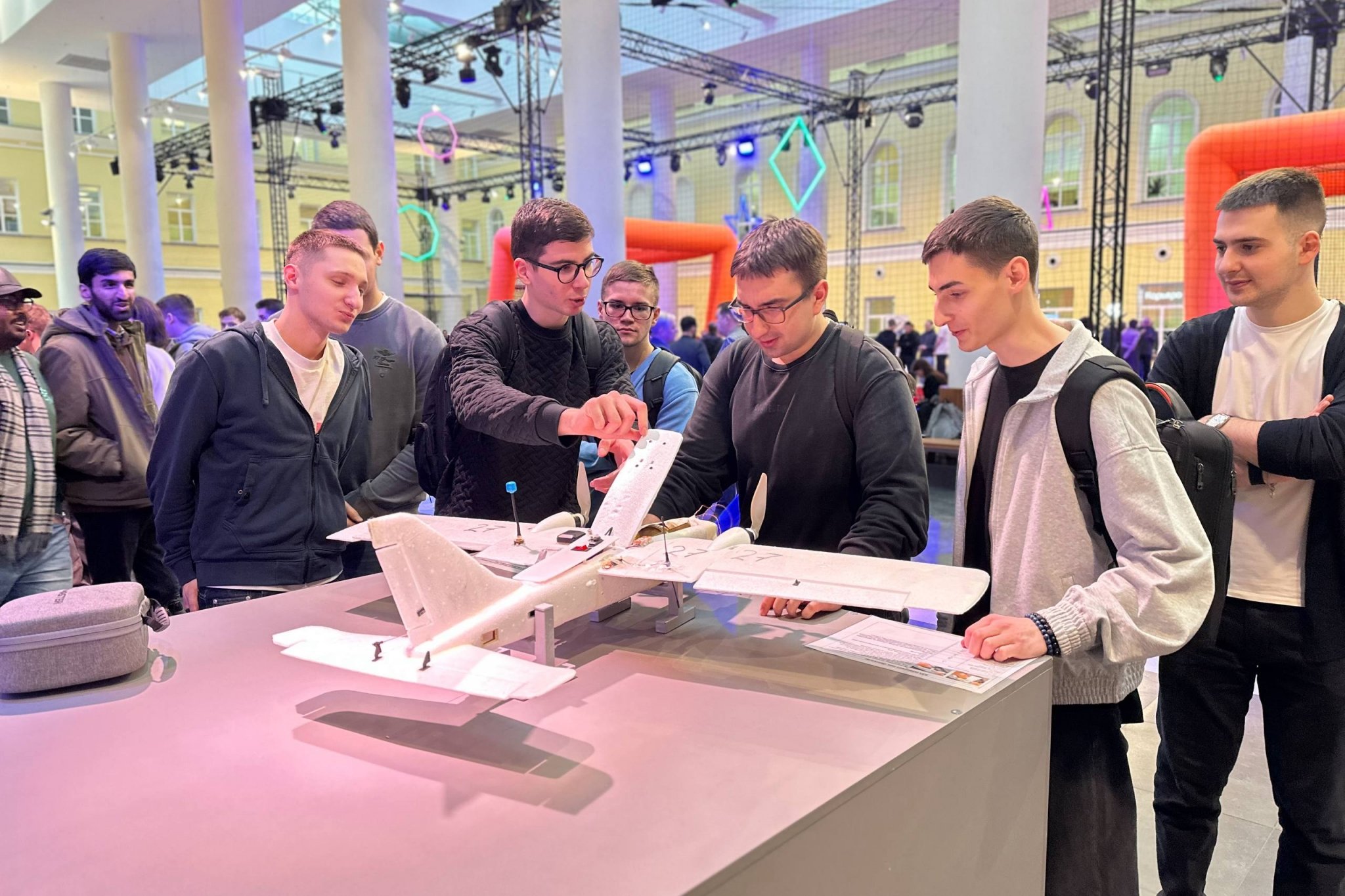 Центральный атриум НИУ ВШЭ превратился в живое технологическое пространство. Гости фестиваля могли не только наблюдать, но и управлять дронами, собирать их в симуляторах, проходить испытания "ТехноГТО", участвовать в гонках и даже попробовать себя в роли операторов боевых беспилотников. Впервые в стенах ВШЭ была собрана полная экосистема беспилотных технологий от научных прототипов и образовательных платформ до систем, применяемых в современных условиях.