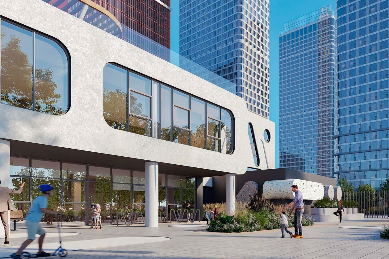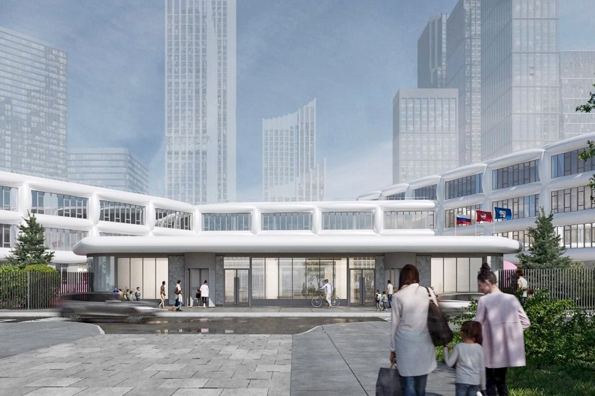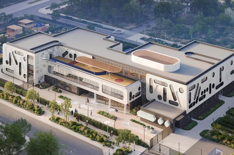 Рядом с учебным корпусом возведут отдельный детский сад на 300 мест. Его архитектура будет напоминать книжную полку благодаря сочетанию объемов, света и цвета. Во дворе обустроят игровые и спортивные площадки, а территорию озеленят и дополнят прогулочными маршрутами.