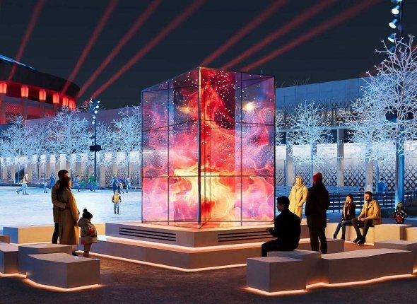 "Центральную часть катка и боковые аллеи объединят с помощью архитектурно-художественной подсветки, звука и инсталляций. Например, центральным элементом площади со стороны набережной станет "Куб энергии" — интерактивная инсталляция, оснащенная аудиосистемой. На одной из аллей будет располагаться мультимедийная пространственная инсталляция "Таинственный лес". В центре катка установят 16-метровую ель с новогодним декором", — сообщается на портале