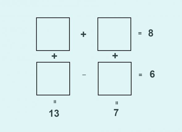 Исходя из картинки мы понимаем, верхние в сумме дают 8, левый столбик 13, правый — 7. Попробуйте решить сами и не листать вниз за подсказкой.