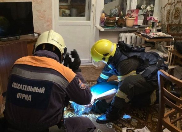 Дверь изнутри оказалась забаррикадирована стремянкой, которая была привязана к ручке и упиралась в пол. Спасатели аккуратно отжали полотно, разобрали конструкцию и проникли в квартиру.