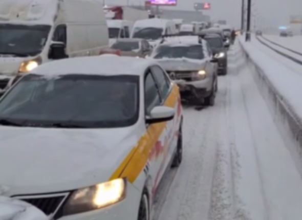 Причиной затора стал сильный снегопад, который продолжает заметать трассу. Интенсивные осадки и ухудшившаяся видимость привели к резкому снижению скорости, образованию заносов и, предположительно, к застреванию грузового транспорта.