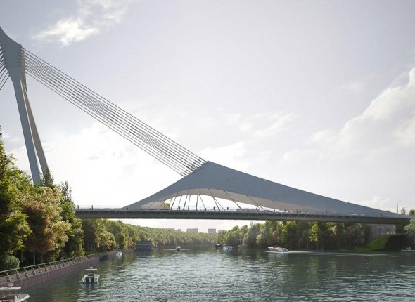Еще одна особенность технологии — возможность создавать выразительный архитектурный облик. Пешеходные мосты в Мневниковской пойме получат арочные формы, напоминающие крылья, а автомобильный мост через Москву-реку у Рублевского шоссе украсят пилоном кольцеобразной формы.