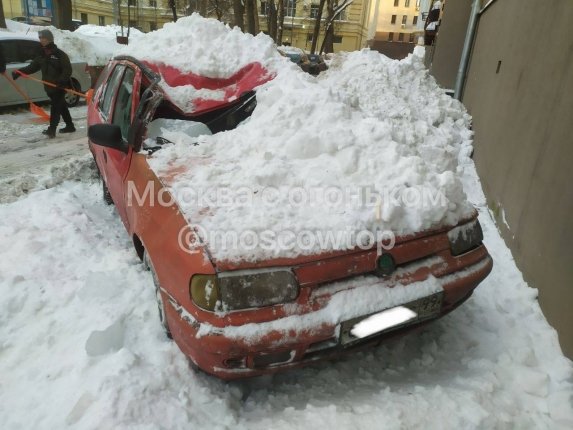 Похожая ситуация произошла и неподалеку. В районе Аэропорт коммунальщики счищали снег с крыши дома. Однако внизу нет оградительной ленты, а еще стоит машина. В итоге снег падал прямо на припаркованный авто.