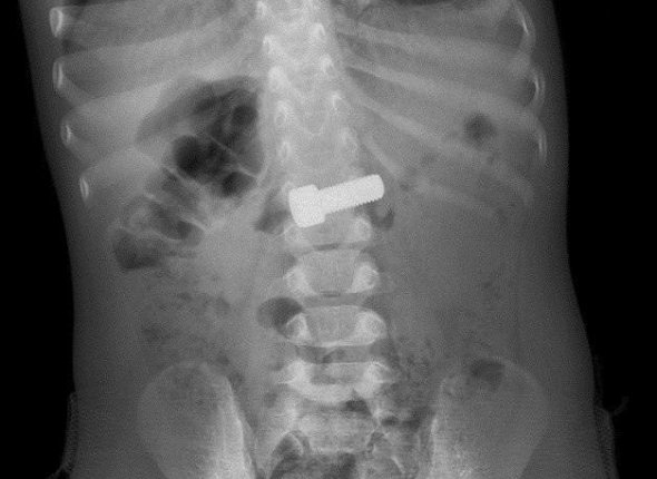 Ребенок во время игры нашел металлический болт и проглотил его. Родители сразу заметили опасность и вызвали скорую помощь. Малыша доставили в приемное отделение центра, где ему оперативно сделали рентгеновское исследование. Снимок показал, что предмет уже находится в желудке.