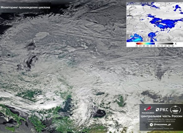 Госкорпорация "Роскосмос" опубликовала спутниковые кадры мощного циклона, который принес в Москву продолжительный снегопад. За прохождением атмосферного фронта наблюдают космические аппараты дистанционного зондирования Земли.