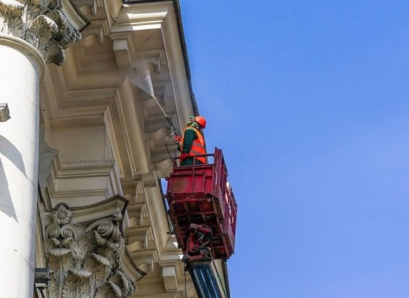 Здания, расположенные вдоль дорог с интенсивным движением, промывают по всему периметру, а постройки внутри кварталов — частично. На наиболее загрязненных участках применяют специальные моющие средства. Пену оставляют на 10–15 минут для растворения грязи и копоти, затем поверхности смывают водой. Работы проводят только при плюсовой температуре.